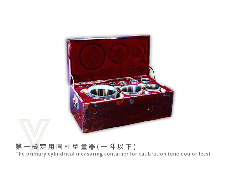 日本時期臺灣總督府專賣局度量衡所用來檢定容器是否合於容積標準的檢驗器具。它一套共有11個,最大的容積為1斗,最小的1勺。本文物裝載箱外寫著「臺灣總督府」字樣,為其使用年代提供一項佐證。