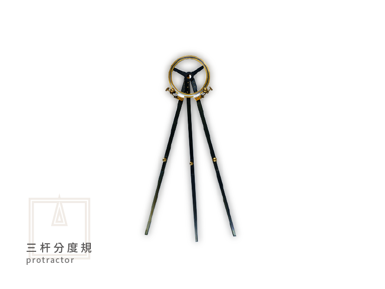 三杆分度規 大型分度規,為繪製中、大型地圖專用,附有加長之延伸杆,可360度旋轉,為國軍之擄獲品。 This is a large graduated circle, specifically designed for drawing medium to large maps. It comes with an extended rod for added reach and allows for 360-degree rotation. This instrument is a captured item from the Nationalist military. 其他展品